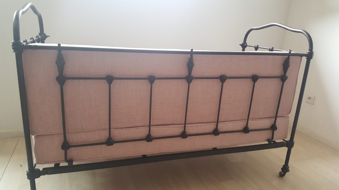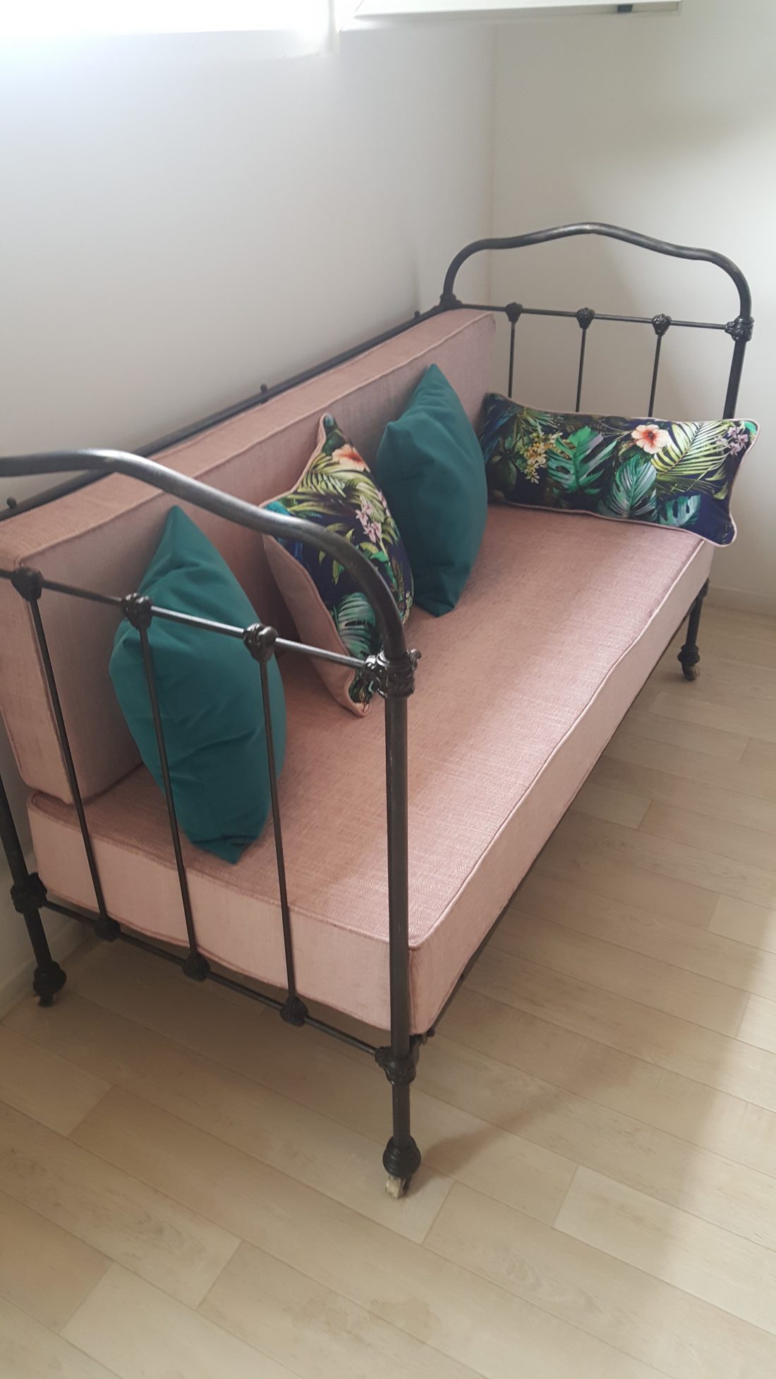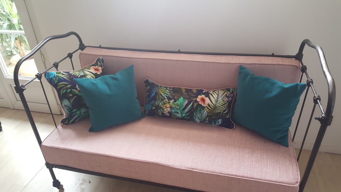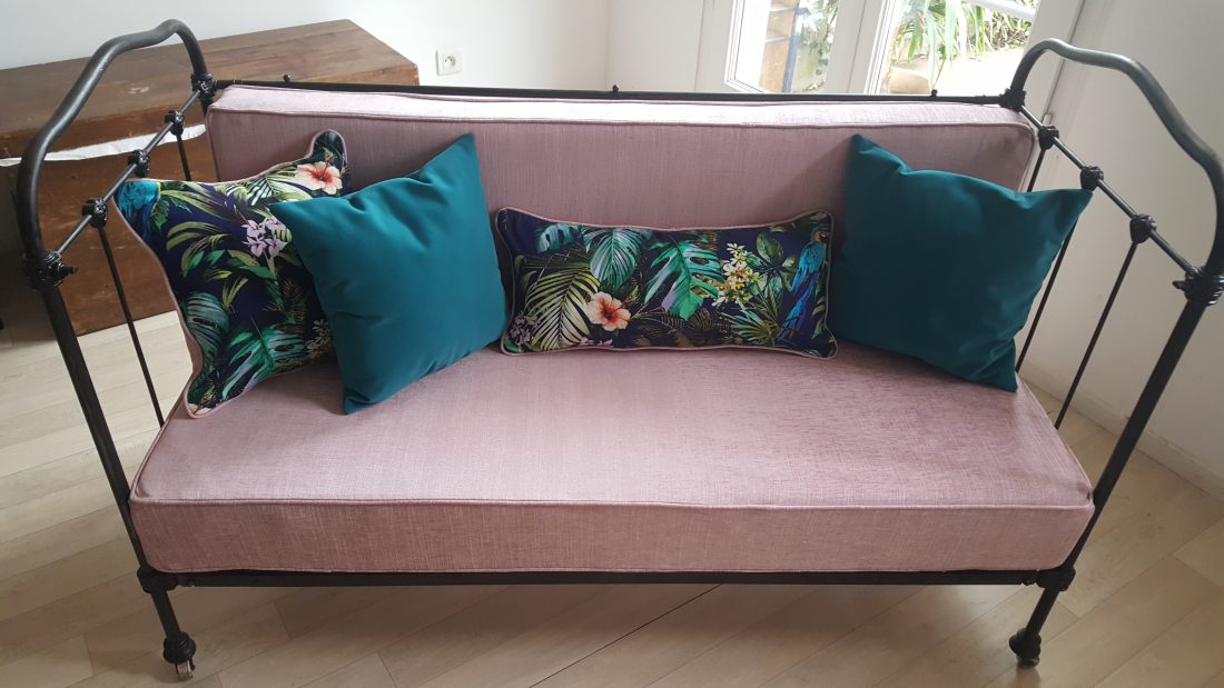 Lit en fer forgé noir enfant destiné à devenir une banquette d’appoint. Création intégrale avec la confection de la housse de l’assise et de la housse du dossier. Confection de coussins de différentes tailles. Tissu assise et dossier : Clarke & Clarke. Tissu coussins : Casal. Garniture contemporaine en mousse.