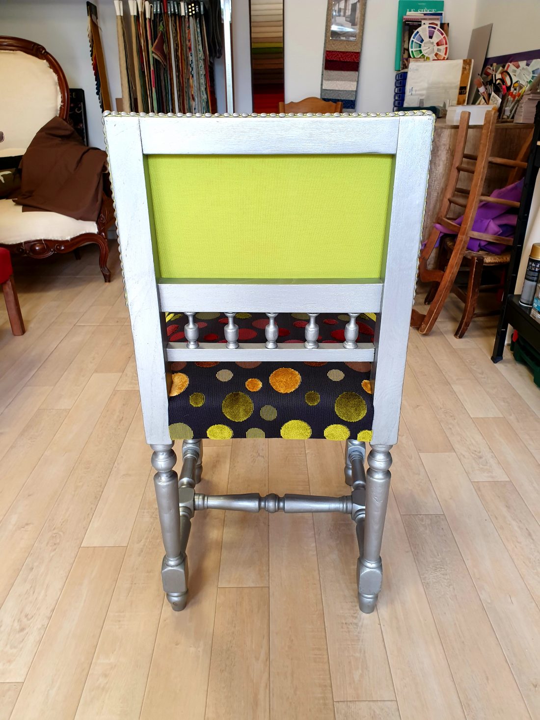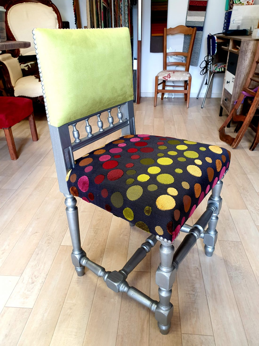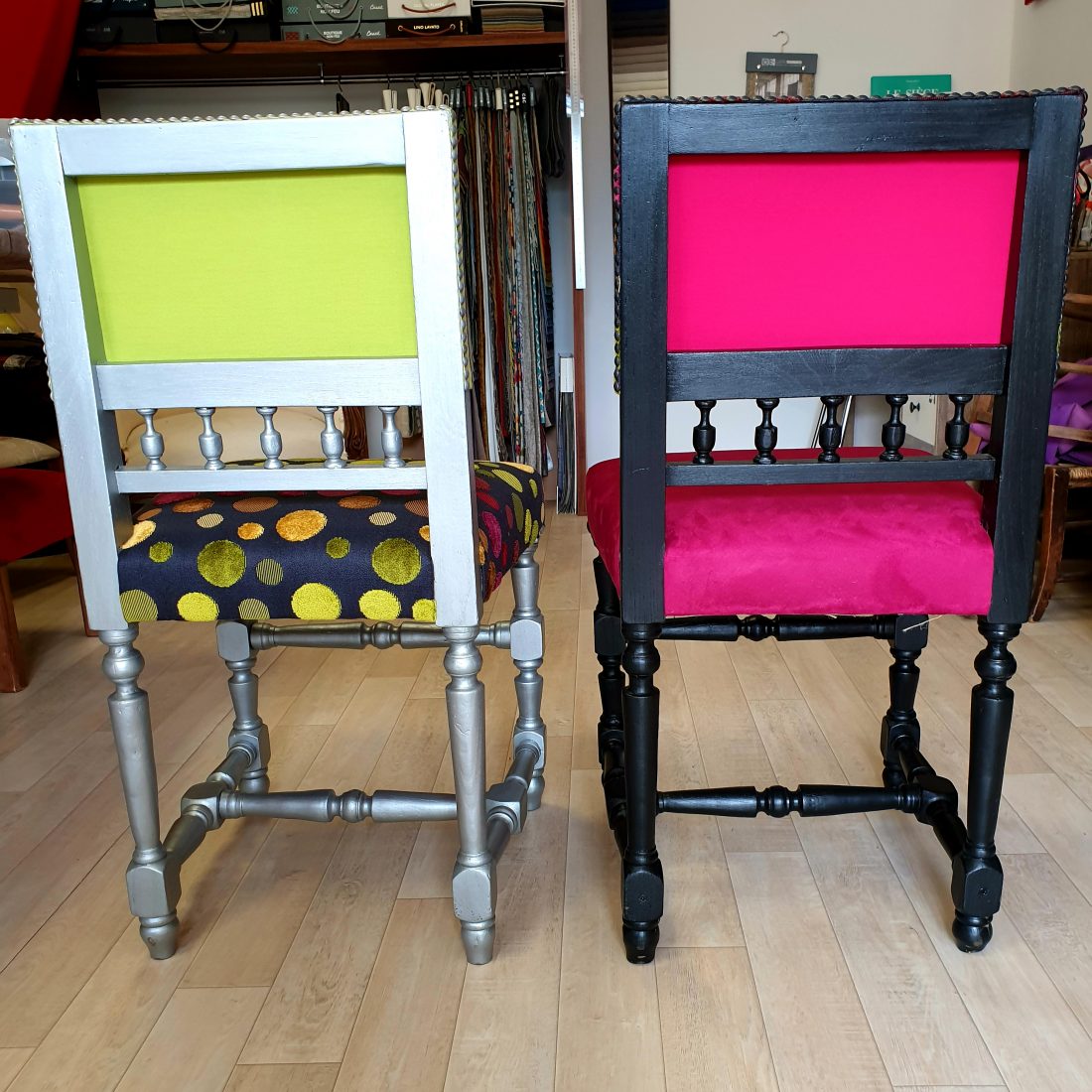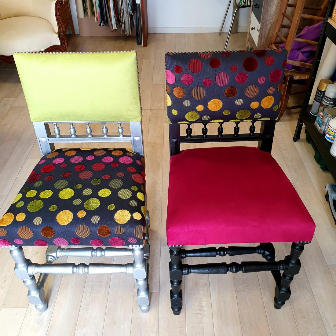 Réfection complète pour ces 2 chaises : peinture noire et argentée, garniture mousse, couverture tissu Deschmaker, finition clous