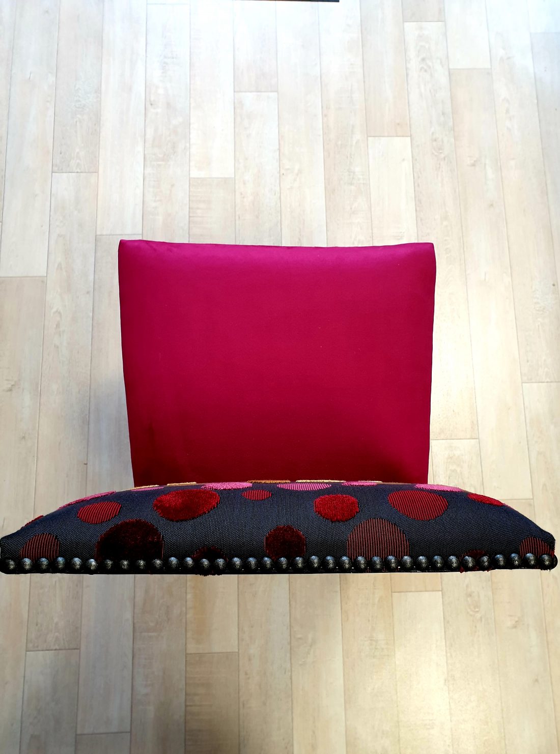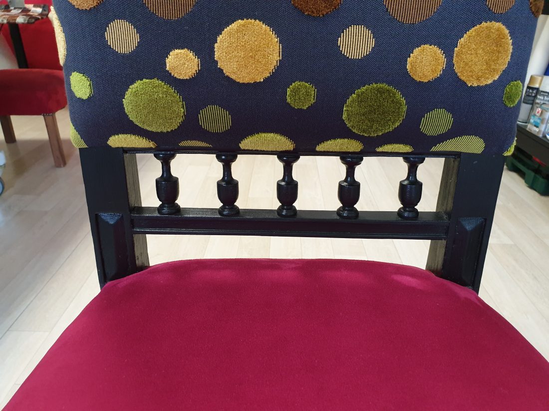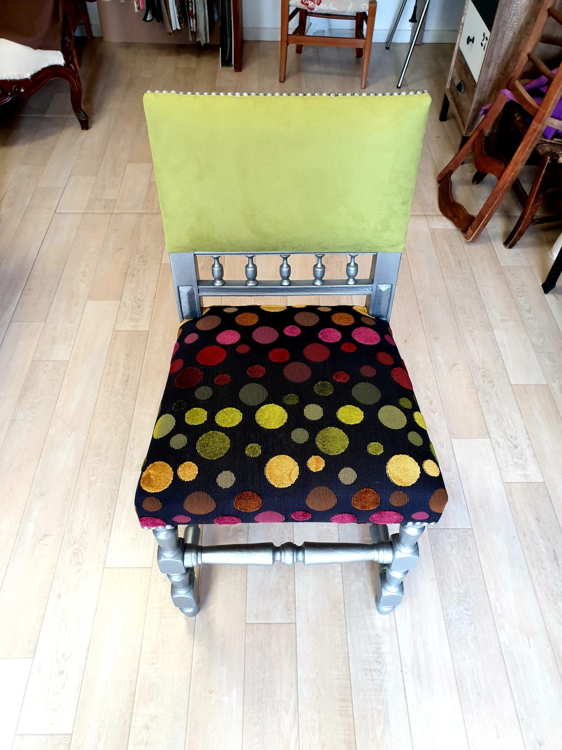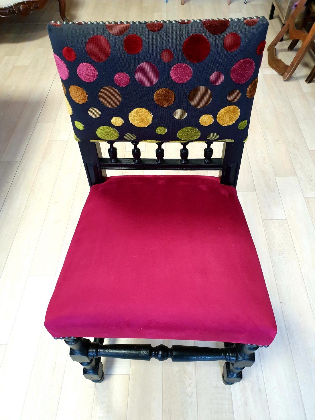 Réfection complète pour ces 2 chaises : peinture noire et argentée, garniture mousse, couverture tissu Deschmaker, finition clous