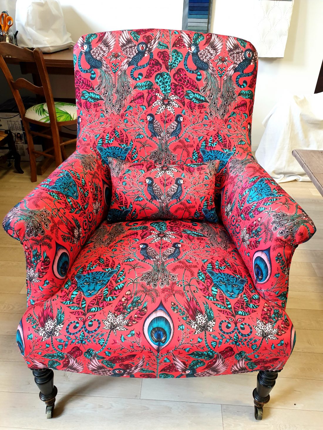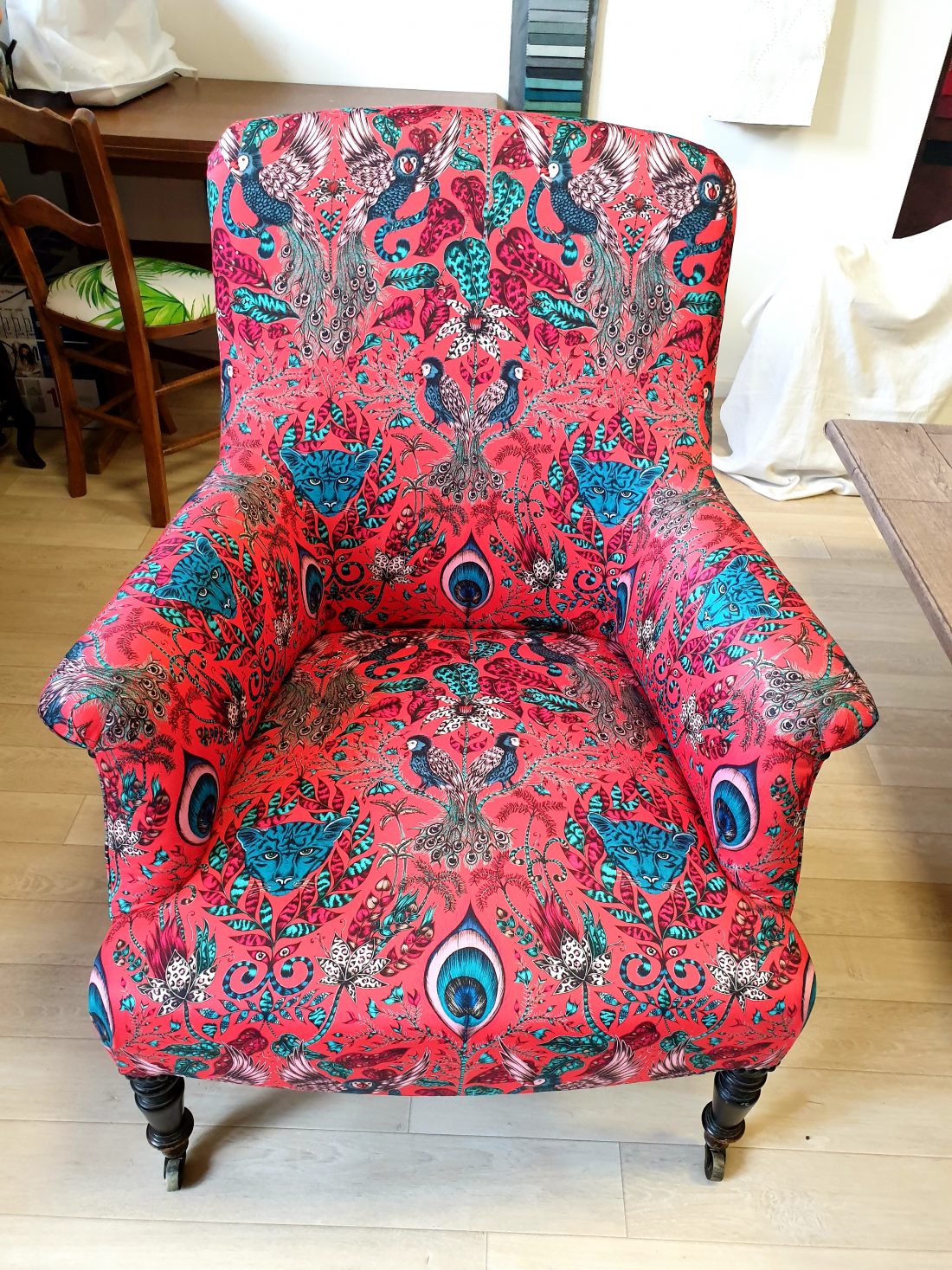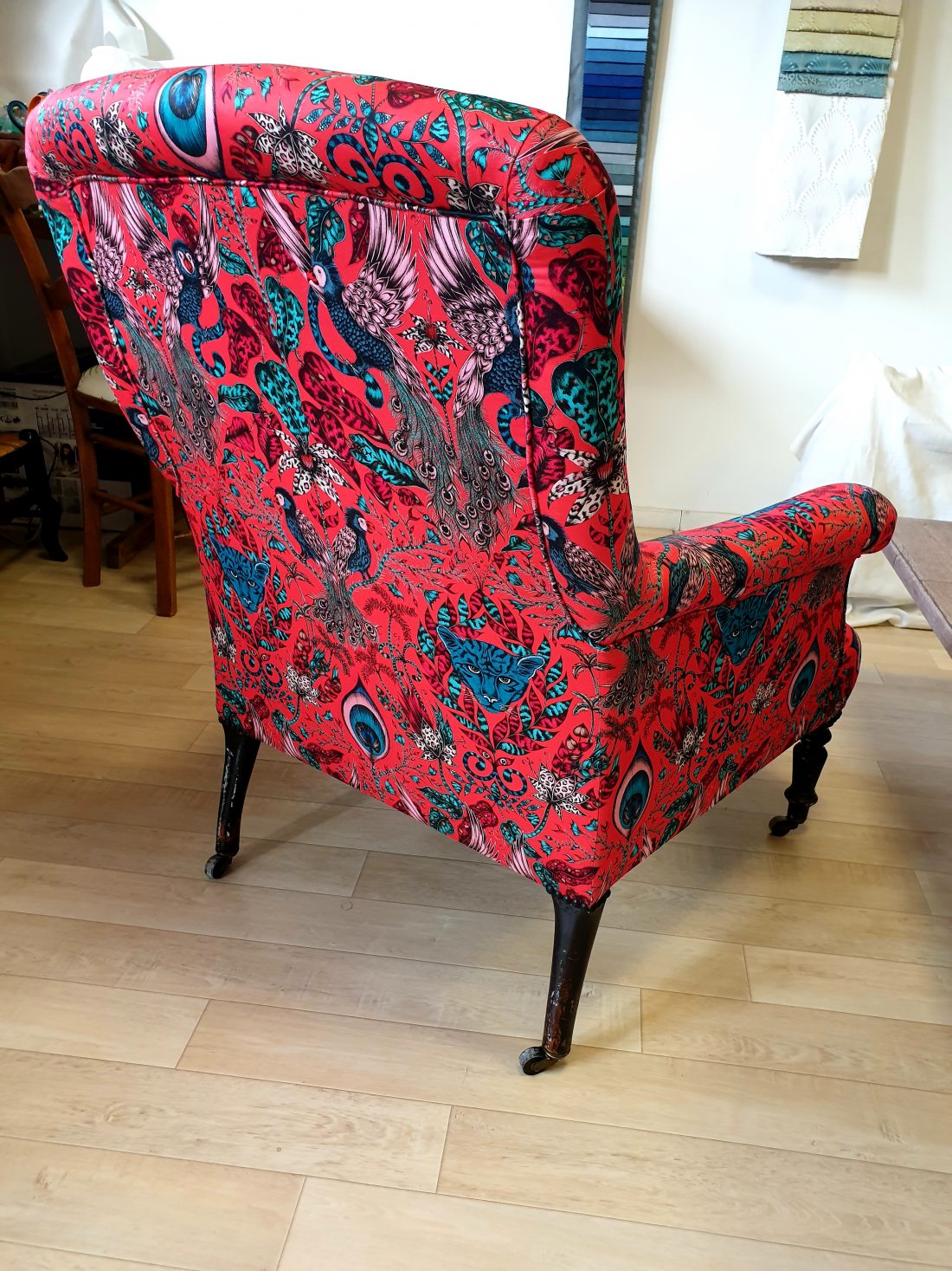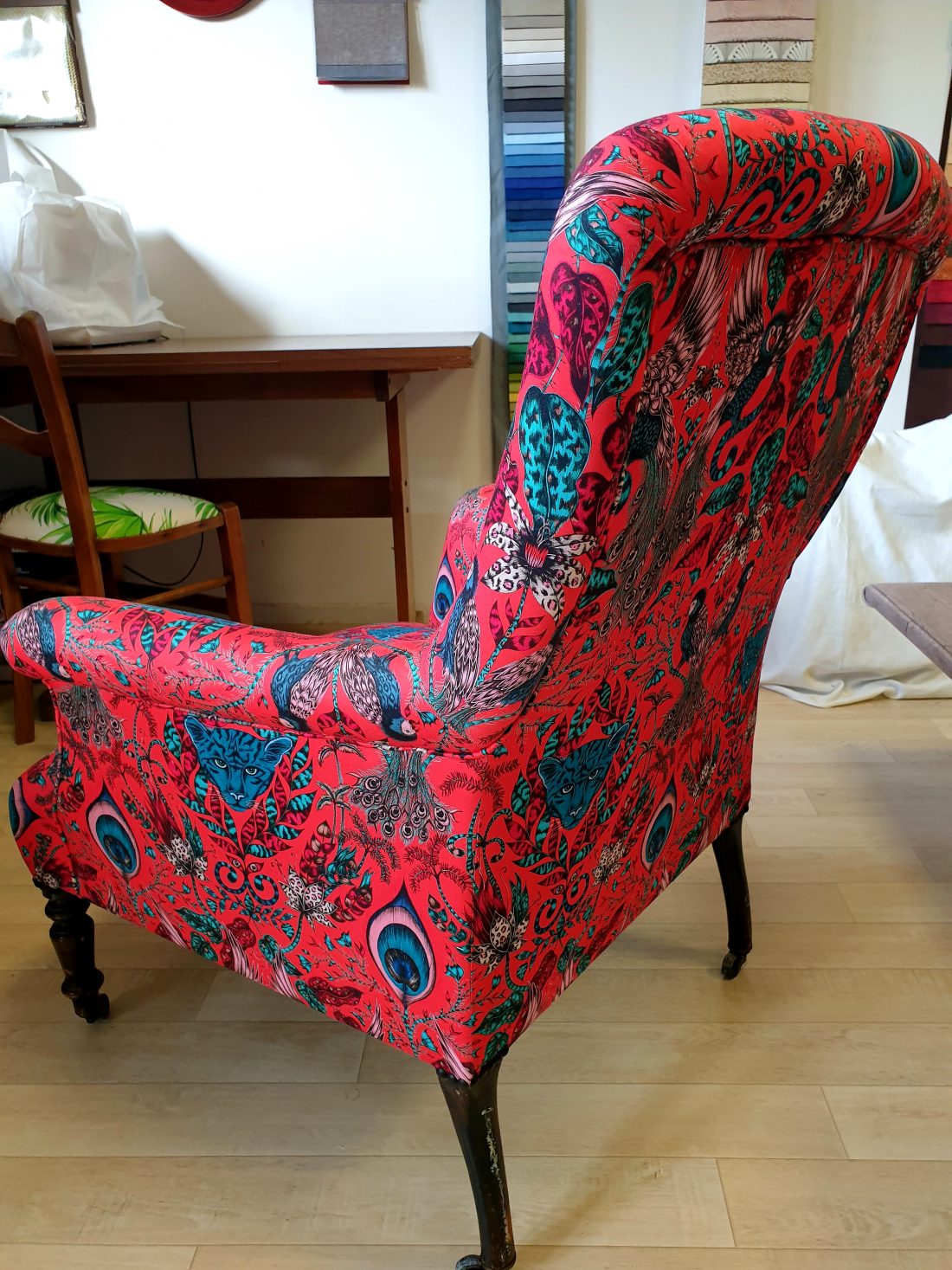 Couverture fauteuil anglais Napoléon III. Tissu Clark and Clark.
