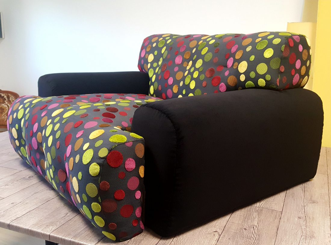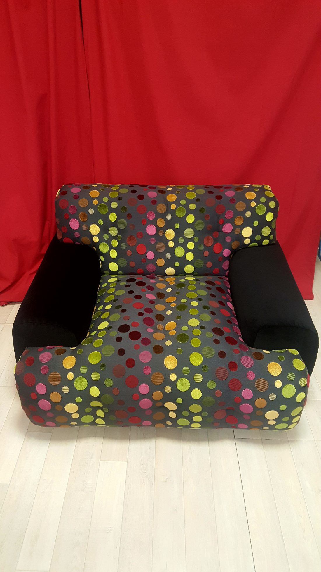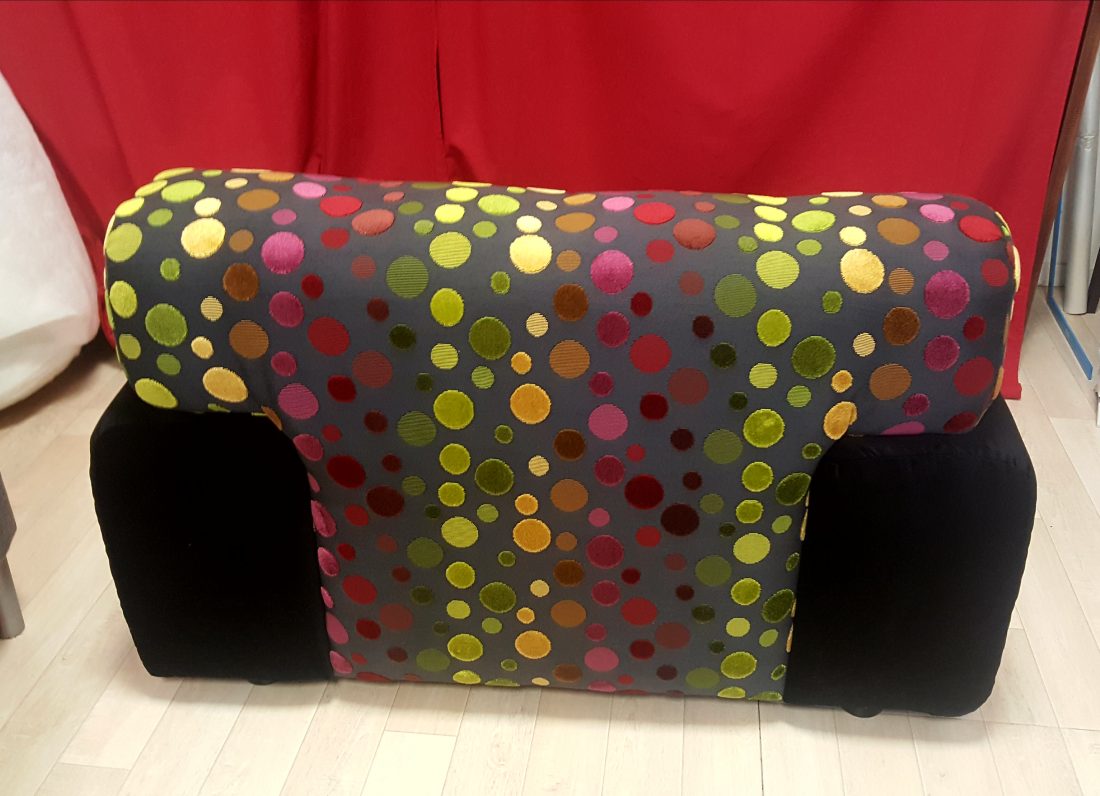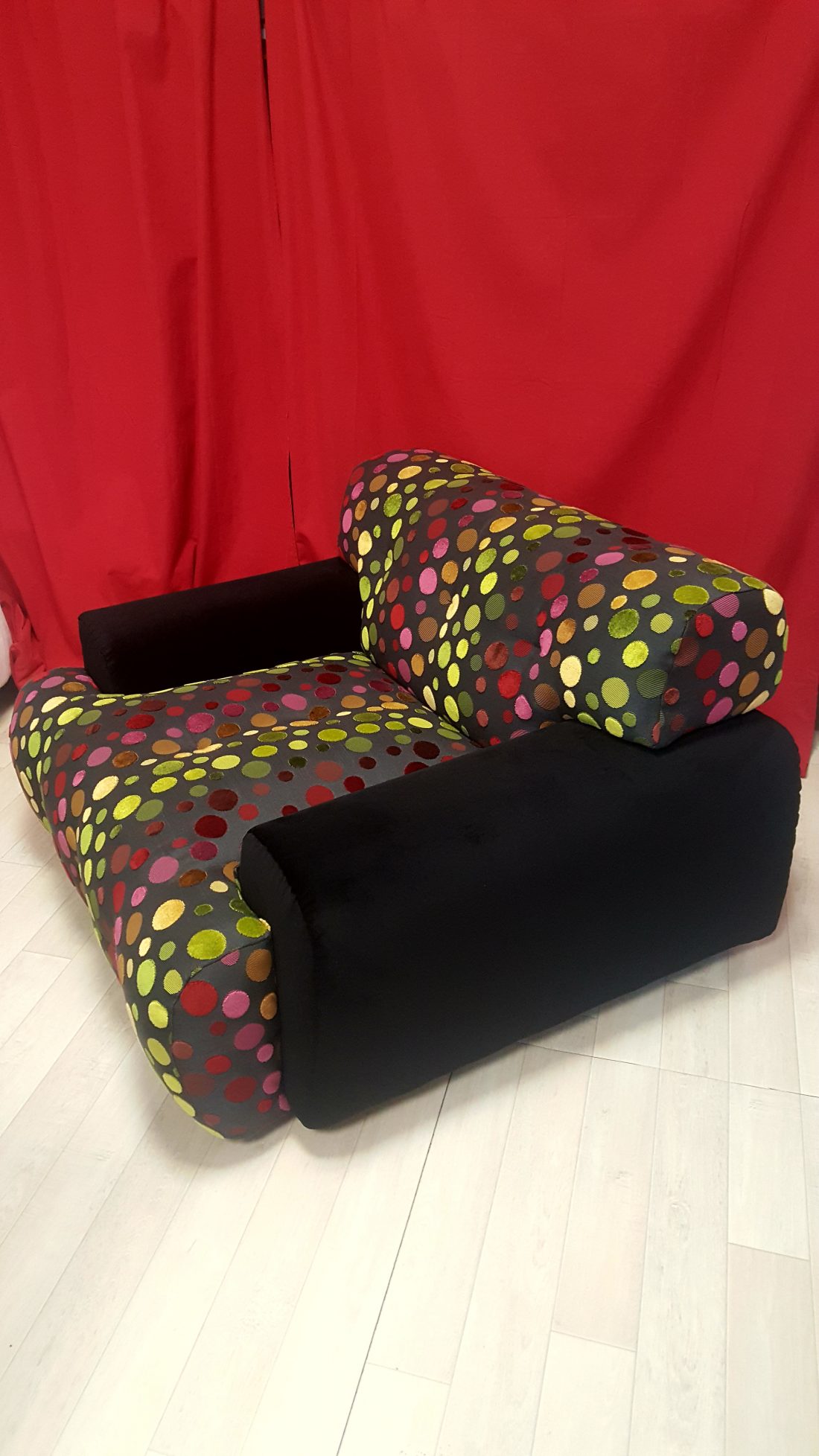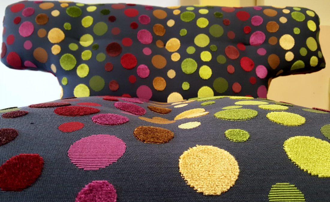 La réfection de ce fauteuil contemporain consiste à changer le tissu et sa couleur tout en gardant son style très déco. Un tissu noir en velours pour les accoudoirs, un tissu à pois colorés en velours sur fond gris en coton très serré.