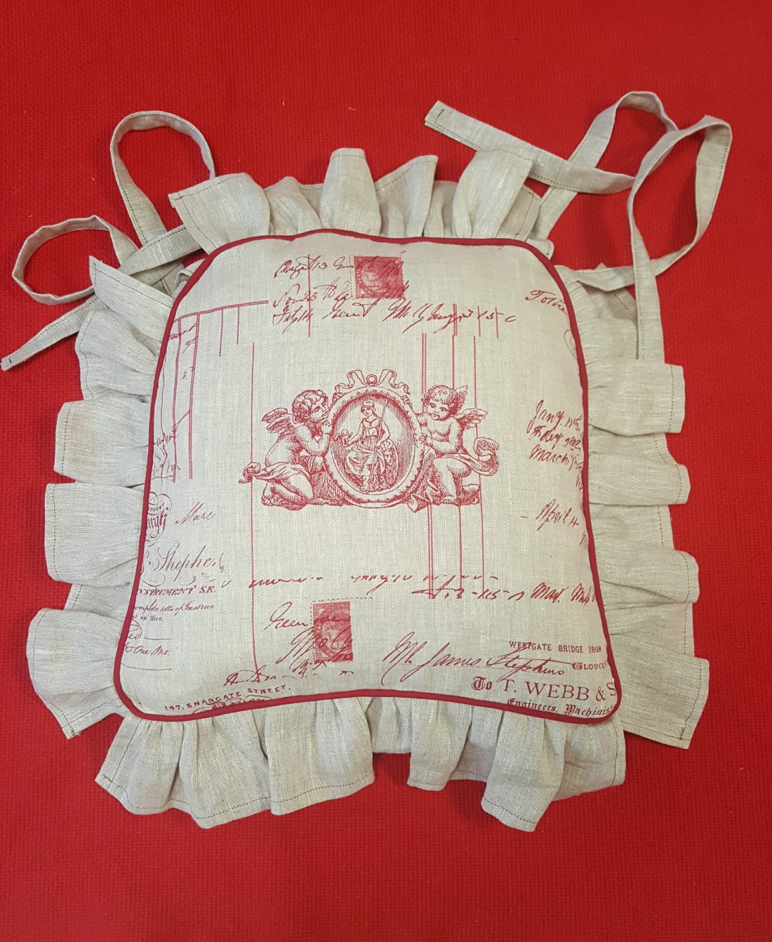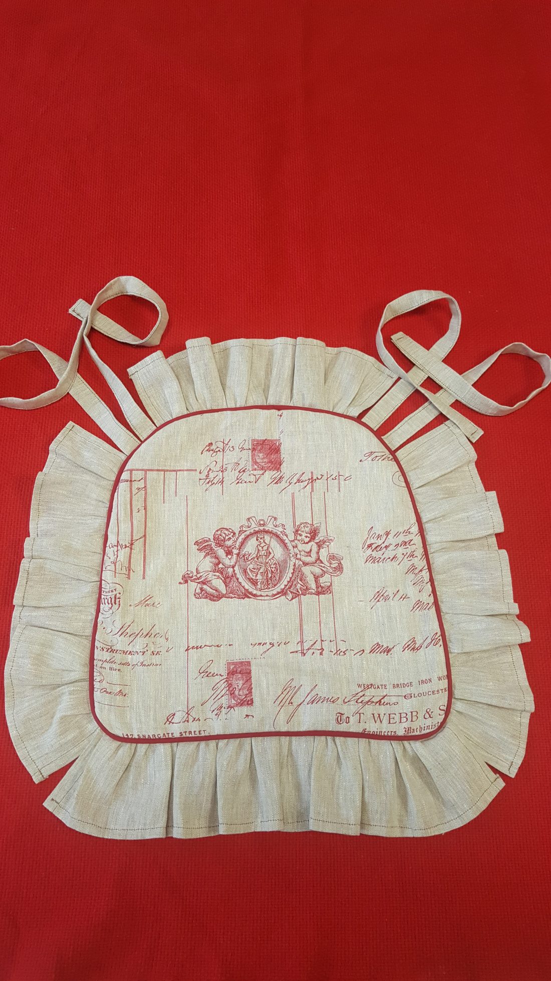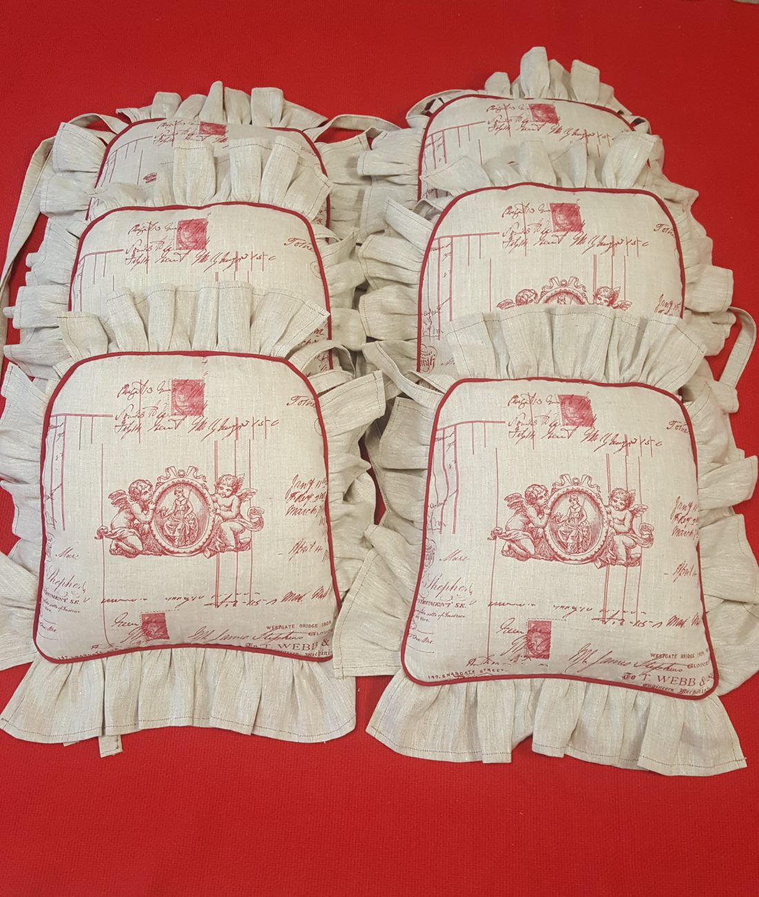 Confection de galettes de chaises. Housses à volant, liseré rouge, tissu lin, motifs angelots. Et confection des coussins avec une garniture en fibre cardée.