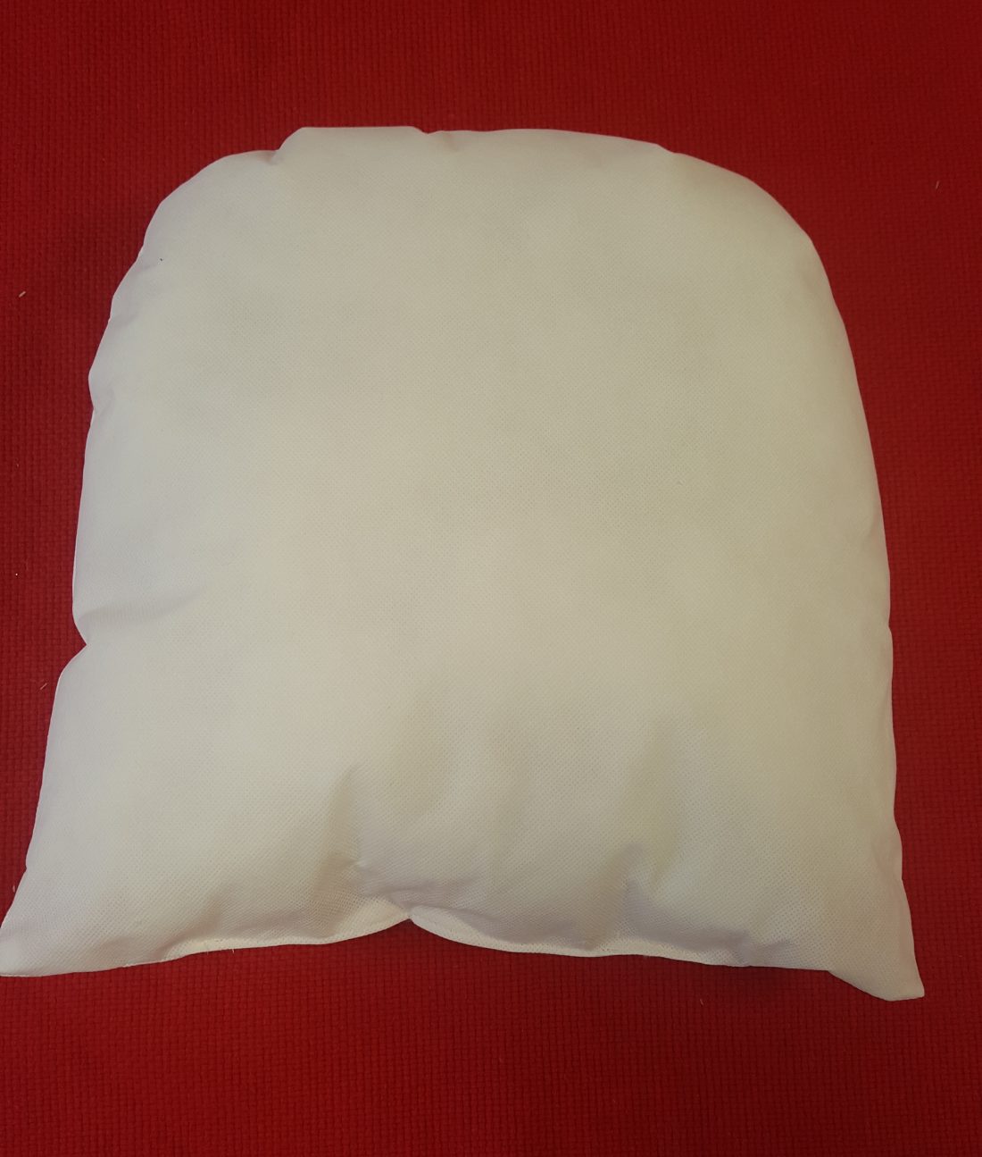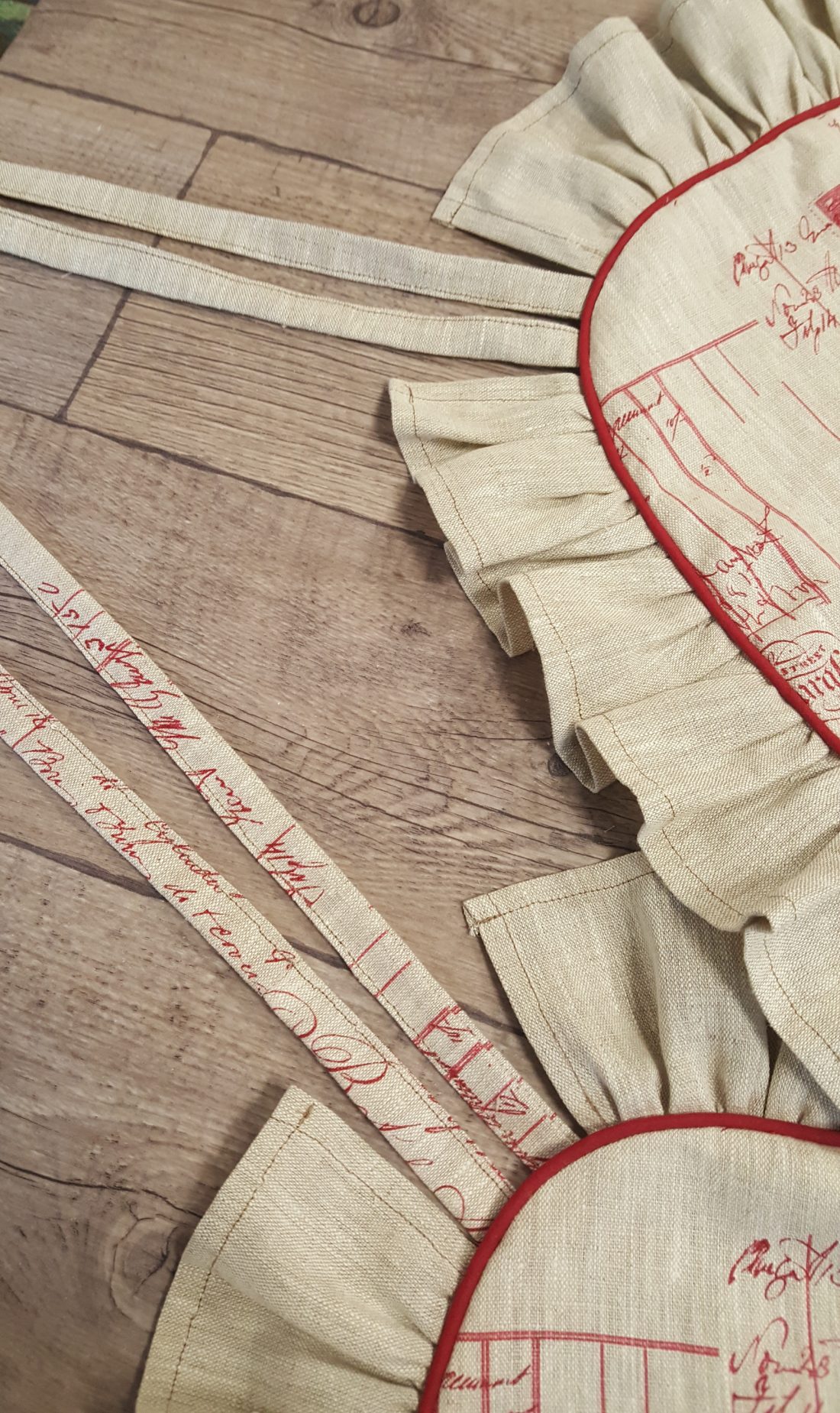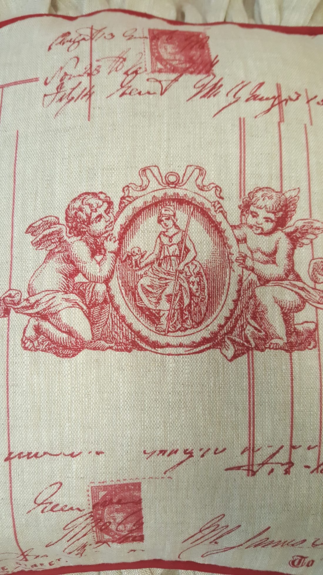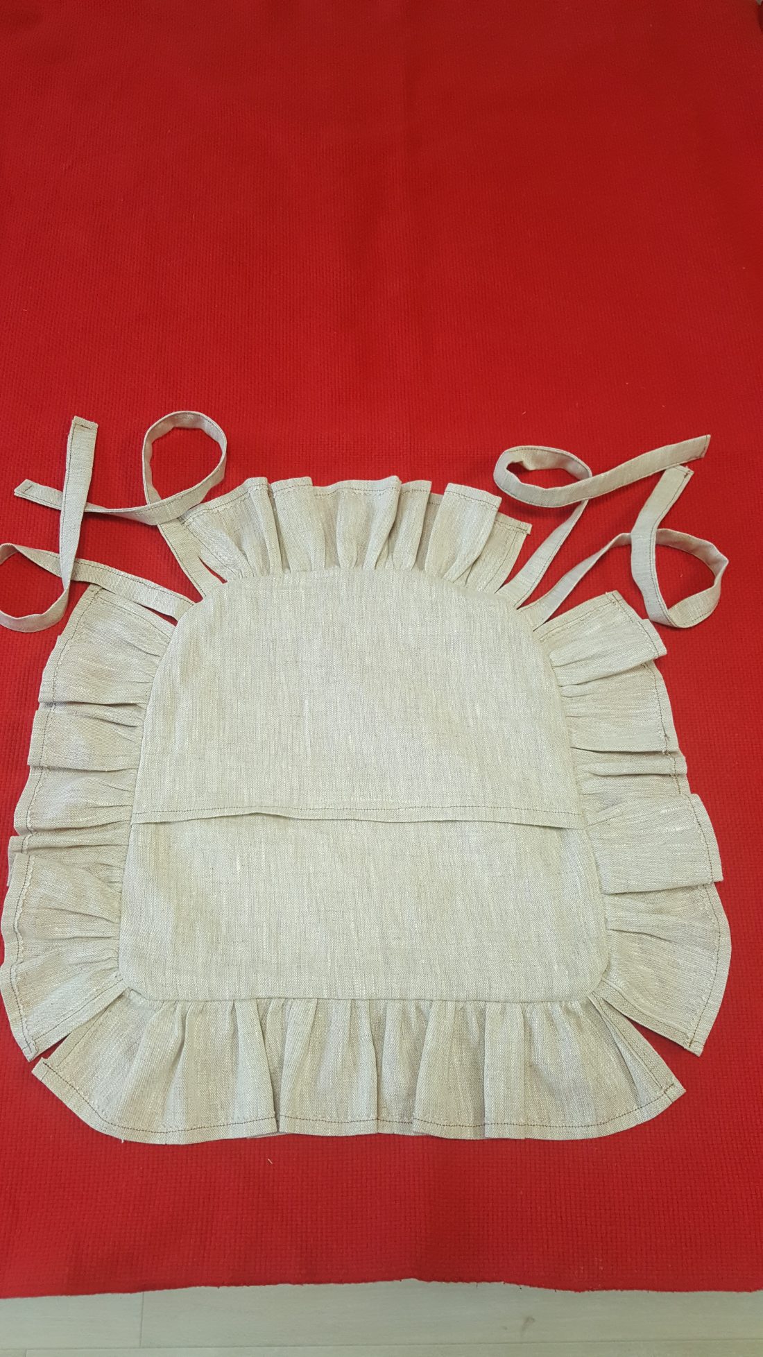 Confection de galettes de chaises. Housses à volant, liseré rouge, tissu lin, motifs angelots. Et confection des coussins avec une garniture en fibre cardée.