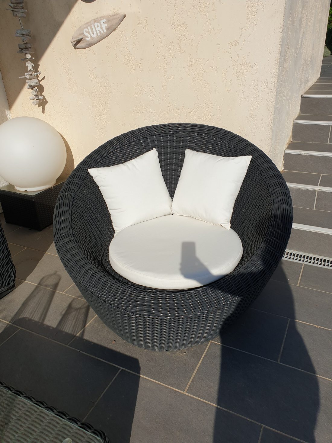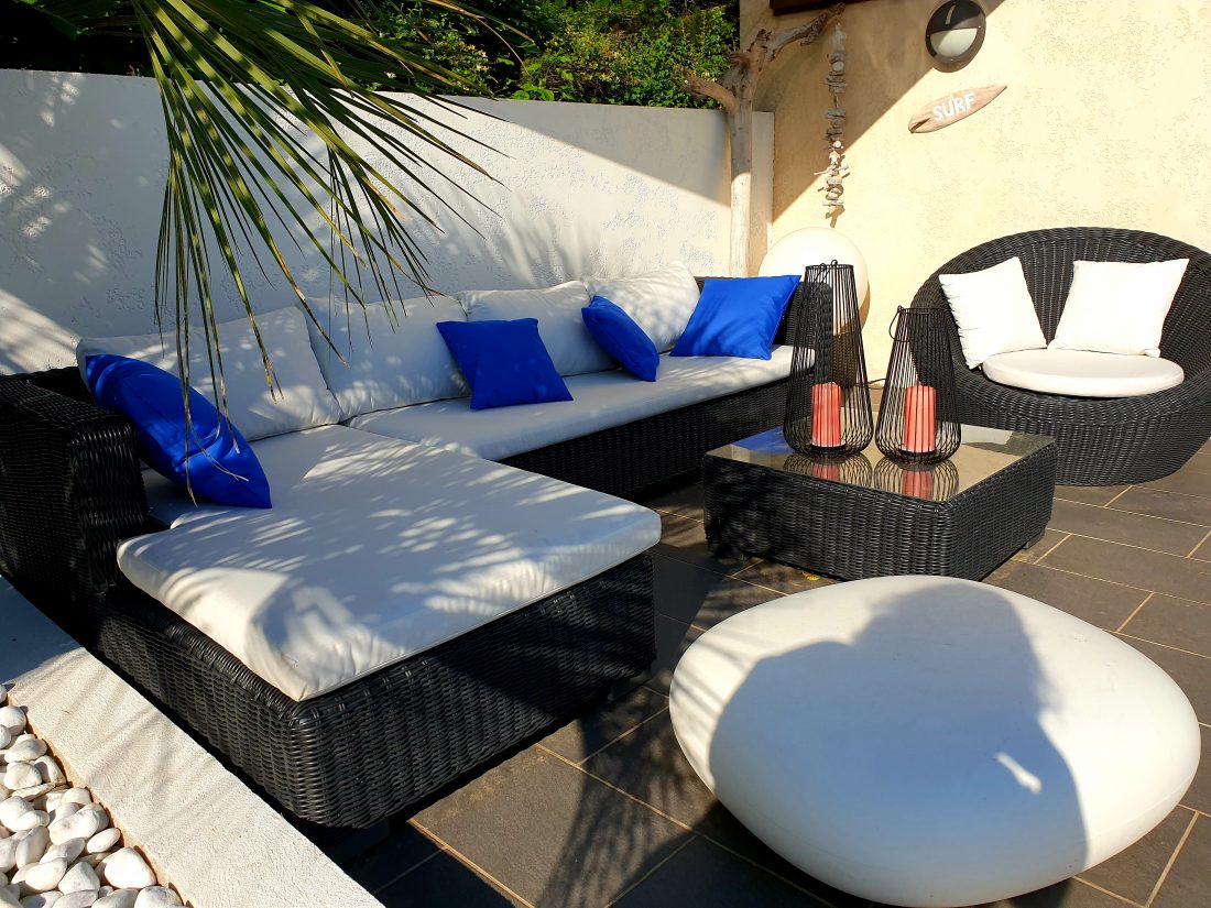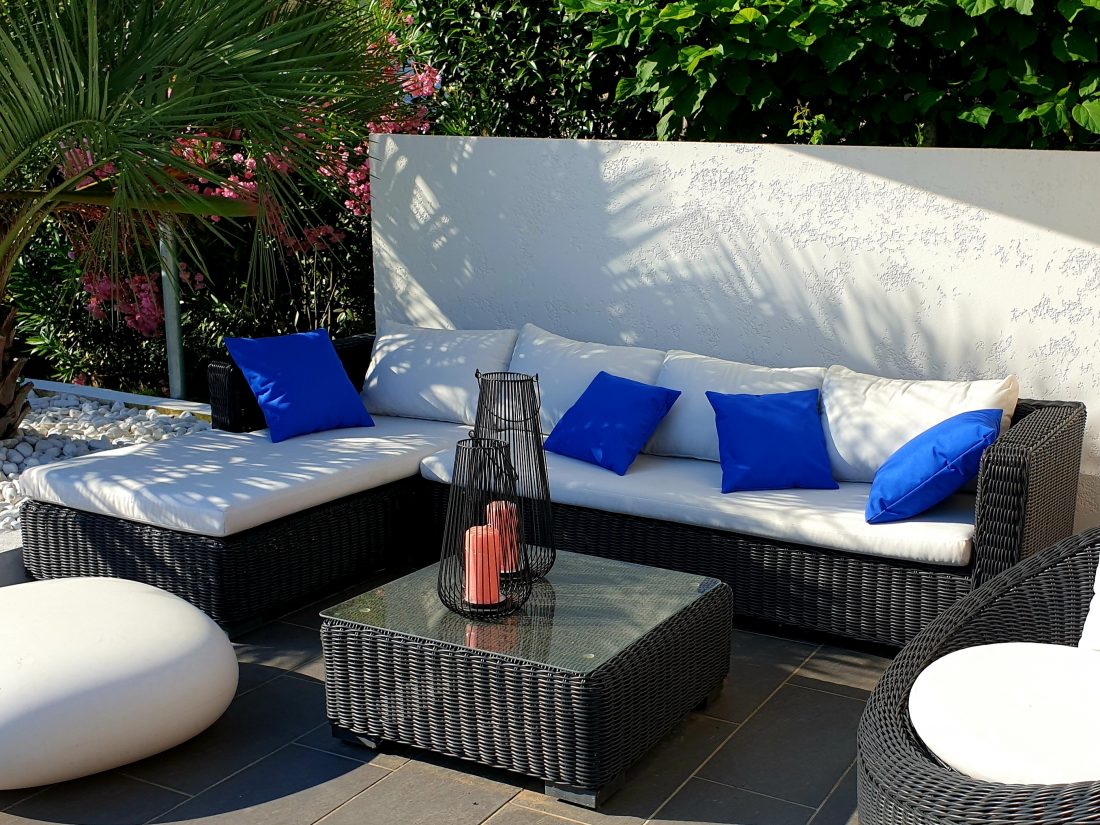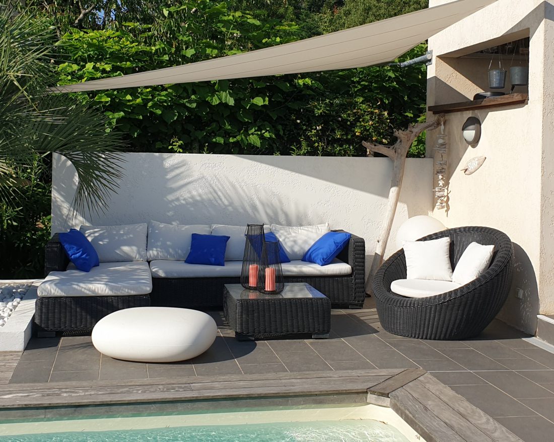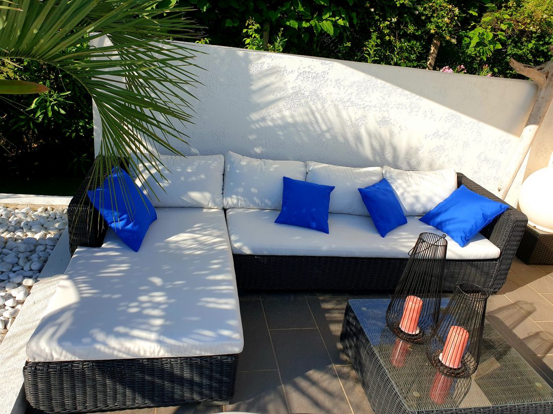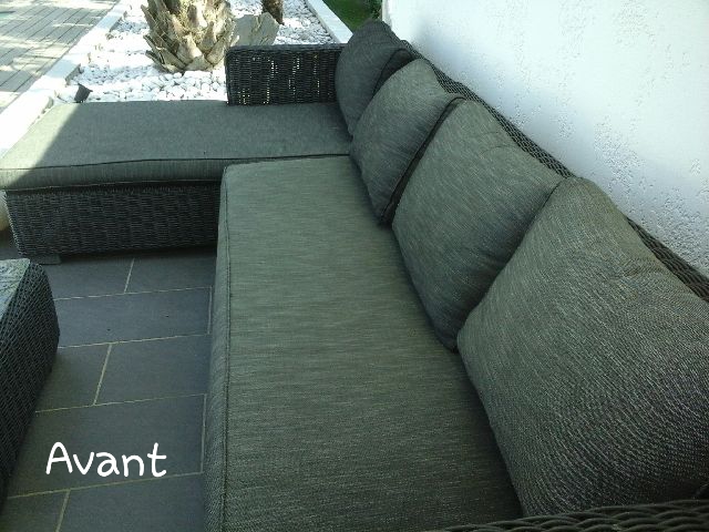 Changement de couleurs pour ce salon de jardin avec la confection de nouvelles housses. Tissu d’extérieur.